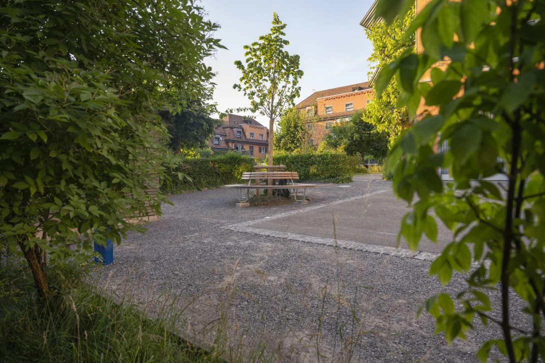 Die naturnahe Umgestaltung und Aufwertung des Röslihofs wurde im Herbst 2025 abgeschlossen. Neben vielen naturnah gestalteten Flächen mit einheimischen Pflanzen, die zu mehr Biodiversität beitragen, sind neue attraktive Aufenthaltsorte für die Bewohner:innen entstanden.